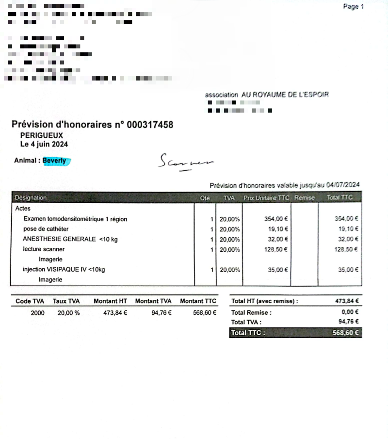 Nous vous mettons la première facture du 03/05, les devis du scanner pour Beverly et de l'intervention pour Eden... en espérant que nous serons aidés, car sinon, malheureusement, on ne pourra pas continuer les examens et les interventions, ce qui fait que nous devrons par la même occasion arrêter les prises en charges malgré les nombreuses demandes 😔