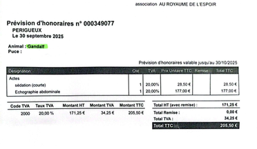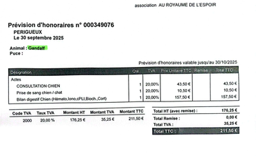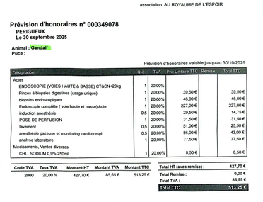 Donc dans un premier temps, ce sera prise de sang (les loulous de notre association y ont de toute façon souvent le droit à partir d'un certain âge) et bilan digestif avec la vétérinaire. Ensuite, selon les résultats et selon ce qui nous sera conseillé, on pourra éventuellement prévoir une échographie abdominale pour approfondir sur ses soucis d'estomac. Et seulement si c'est nécessaire pour lui, il passera une endoscopie (nous avons aussi demandé à avoir ce devis si jamais le docteur nous annonçait qu'il en avait besoin pour une raison ou une autre) !