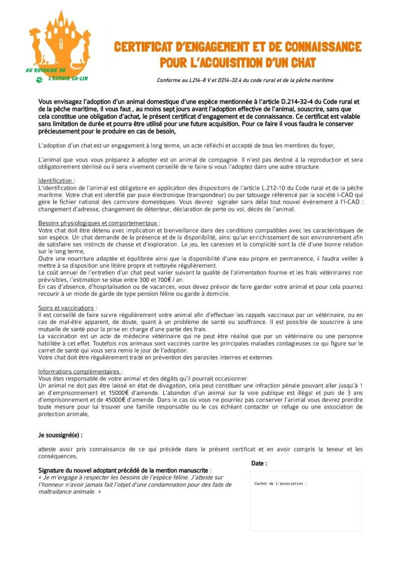 Certificat d'engagement et de connaissance pour l'acquisition d'un chat :